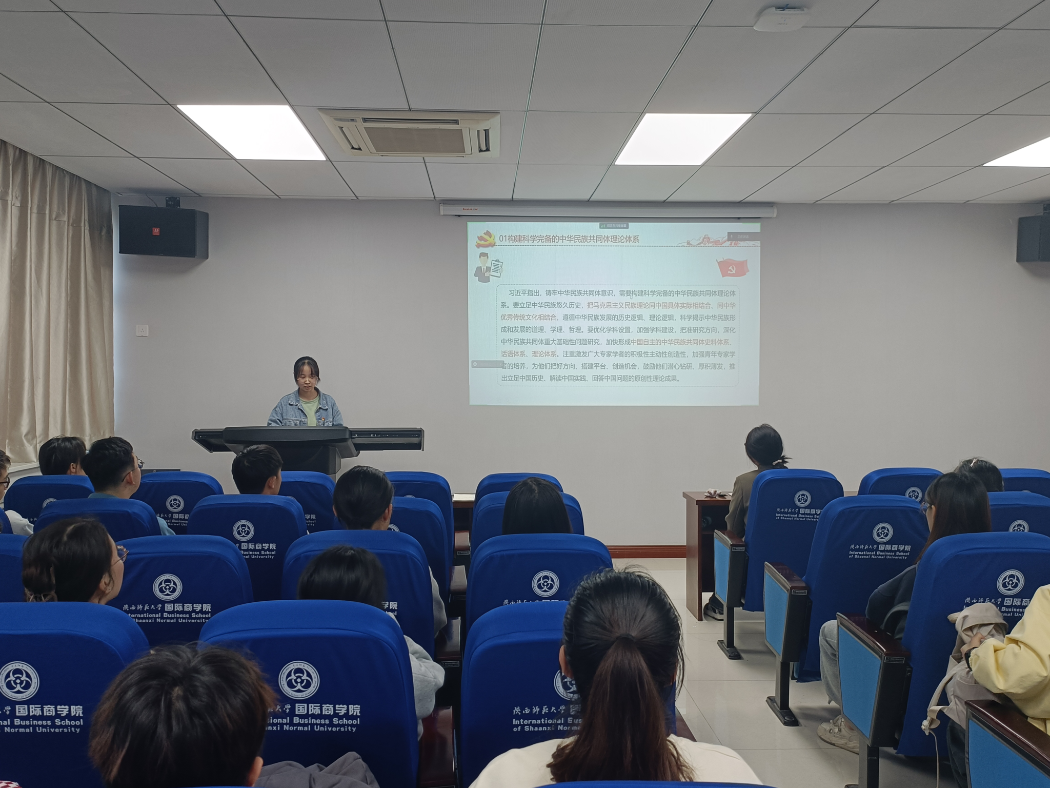 在第一阶段的学习中,宣传委员杨嘉欣同志围绕理论学习主题,从“构建理论体系”“构筑精神家园”“以中华民族大团结促进中国式现代化”“铸牢中华民族共同体意识”四个方面领学。