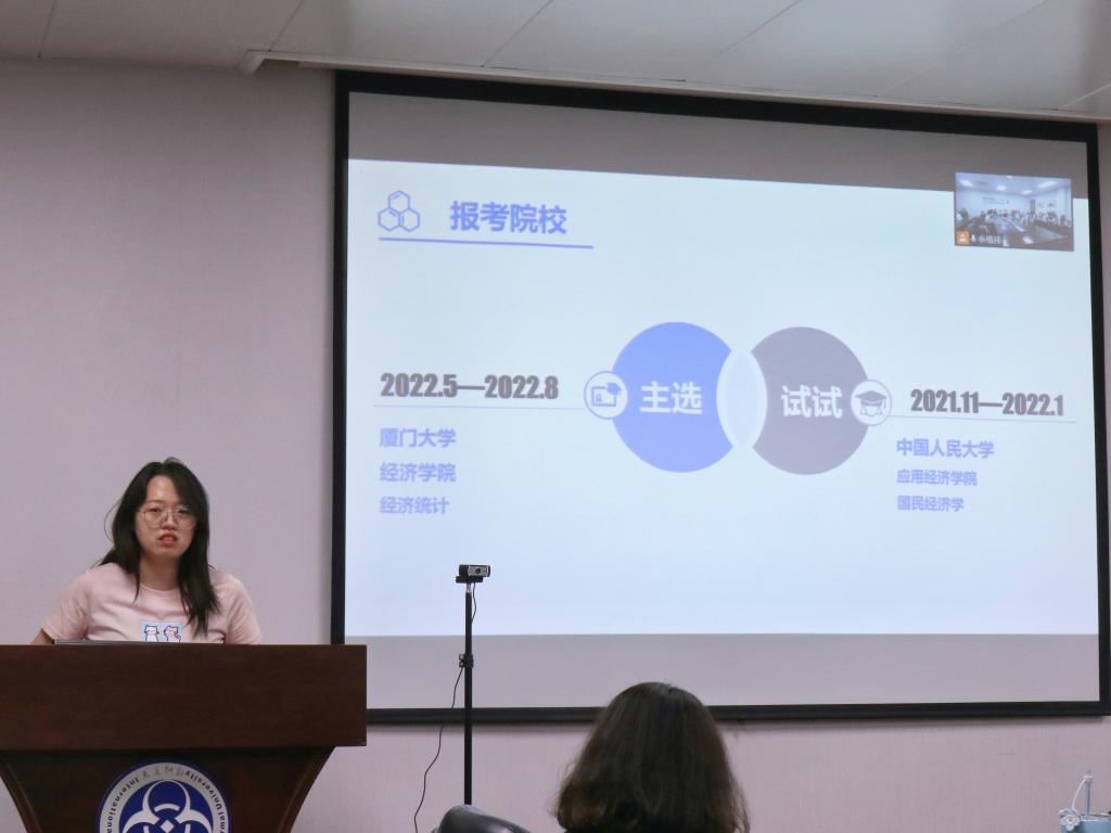 受邀的4位优秀学子依次分享了在自己考博过程中的经验与心得。考入西安交通大学的宋祎结合自身经验就自我认知、考博规划与择校、考试经验、具体准备工作等方面进行了分享,她建议大家先要理性考虑自己是否适合读博,再做好详细的规划准备。考入南京大学的阮莹琳希望大家明确自身目标,并在日常生活中注重对自己逻辑思维能力和表述能力的锻炼,提升自己的竞争力。考入西北农林科技大学的田春燕就自己研究生三年的经济以及自己对考博的认识作了分享,她建议同学们做多手准备,放平心态,找到适合自己的职业选择。考入厦门大学的张丽姣着重分享了在博士备考中如何克服心理问题,她鼓励同学们要积极准备、坚定信心,多与导师和同学们沟通交流,汲取多渠道建议,稳住心态,勇往直前。