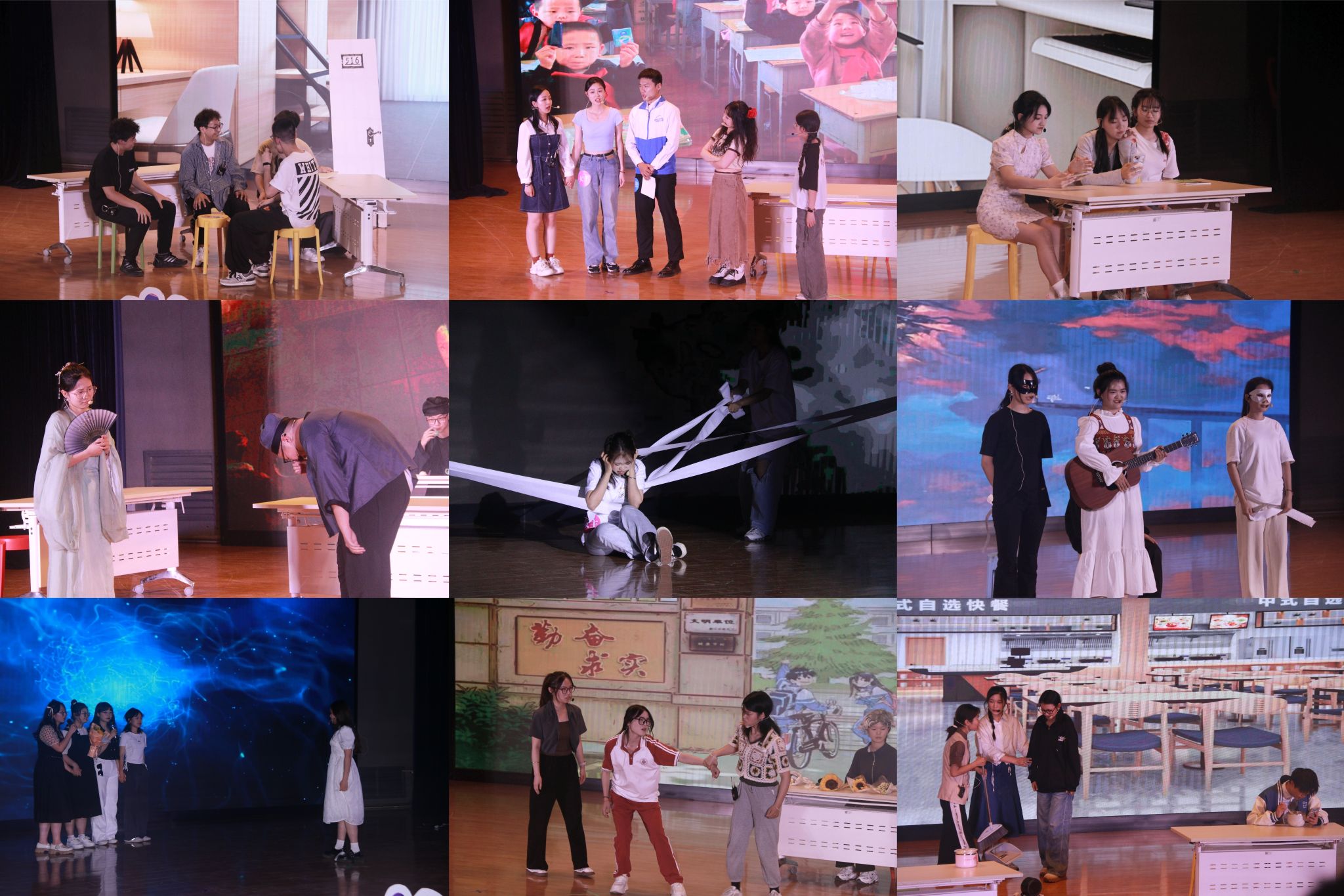 九个剧目聚焦老员工在老员工活中遇到的各种心理问题,以剧目演绎情感变化,用表演回答内心困惑,展示青年员工的活力与自信。《蜕变》传达出人生就是不断突破自我的乐章,只要有迎着逆风飞翔的勇气,自卑的毛毛虫也能蜕变成绚烂的蝴蝶;《声之茧》引导我们接纳不完美的自己,突破自我约束的茧,成为更好的自己;《再见天骄,你好天骄》以不同时期的自己相遇的故事,帮助我们认识选择,在岁月更迭中坚守初心;初入大学的忙碌与茫然都应在《心灵奇旅》中找到归宿,每个人都应在漫漫人生中寻找适合自己的生活方式;不要被“讨好型人格”所裹挟,关心他人的同时,《请别忘了关照自己》;《牧遥》勇敢地面对了伤痛、挫折,接纳了不完美的自己,只有选择原谅,才可不惧将来,不念过往,勇往直前;走过泥泞沼泽,穿过孤独深渊,战胜愚昧偏见,始终要记得《你本来就很好》;《“卷”心菜的初心》是在人生的旅途中,坚守本心、寻求热爱,简单做自己;且看《荆忠报国》演绎荆轲的侠肝义胆、爱国心切,从古代走到今朝,从戏内走向戏外。