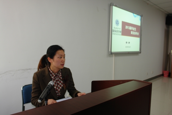 首先,杨静副书记对研究生做了就业指导。杨书记对2013届毕业生的基本情况、近三年毕业生就业率、毕业去向、影响就业的因素及就业形势做了说明和分析;随后,她通过列举公司毕业生的典型案例,告诫研究生只有调整就业期望,端正就业态度,发挥专业优势,突出个人特长才能在就业中取得成功;同时,她还就就业过程中的注意事项做了说明,告知研究生校园招聘不是唯一,要主动“走出去”寻找就业机会;在就业中要有“诚信”意识,在求职材料准备和面试过程中要注重技巧等。