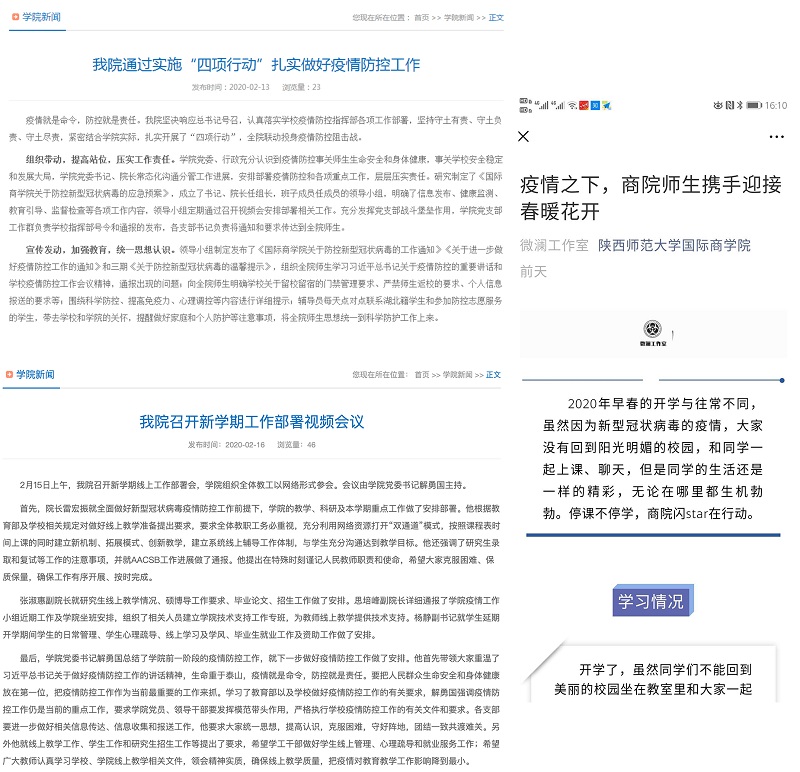 坚持思想引领,强化教育引导,凝聚师生合力。beats365唯一官方网站党委制定了《beats365唯一官方网站党委关于开展疫情防控主题教育活动的通知》,要求公司各党支部、团支部组织师生学习总书记关于疫情防控的重要讲话和公司疫情防控工作会议精神,开展爱国爱党教育、志愿服务、主题摄影征文等活动,引领师生投身疫情防控同时增强对党的领导和社会主义制度优势的认同。辅导员按照党委学工部要求,开展线上“云班会”,开展生命教育、感恩教育和学风引导,确保员工在家时期思政教育不掉线。公司发布了三期《关于防控新型冠状病毒的温馨提示》,通报出现的问题,围绕科学防控、提高免疫力、心里调控等内容进行详细提示。公司网站、微信、微博等平台持续报道公司疫情防控相关工作,报道公司师生先进典型事迹,帮助师生稳定情绪,增强打赢疫情防控阻击战的信心。