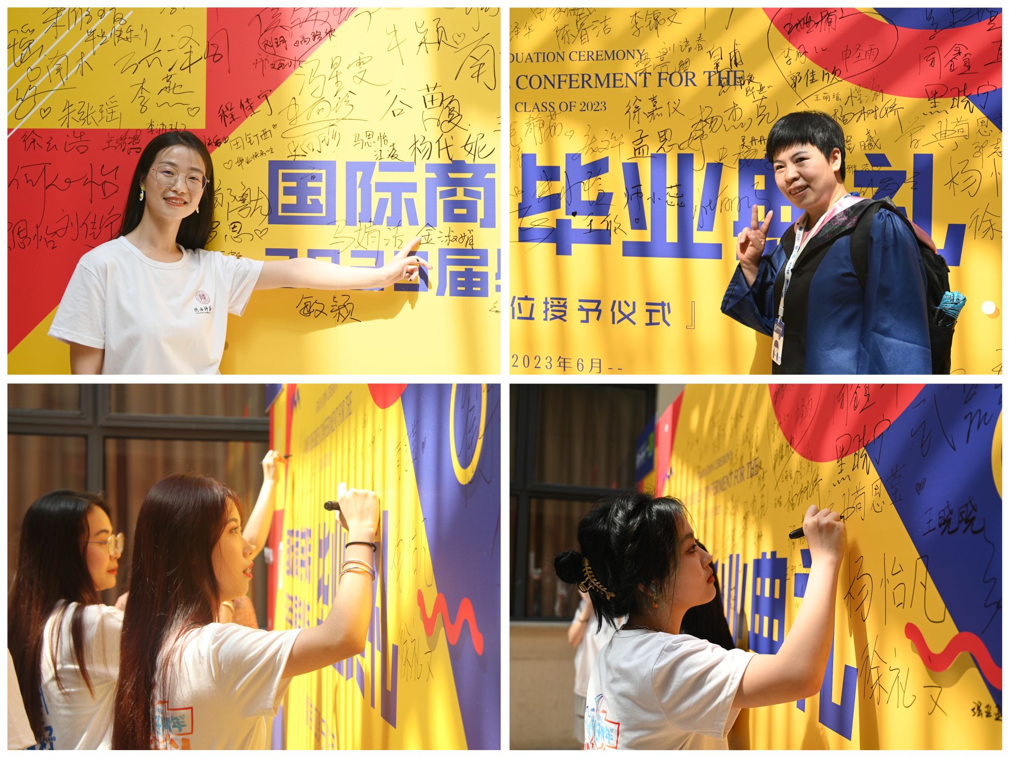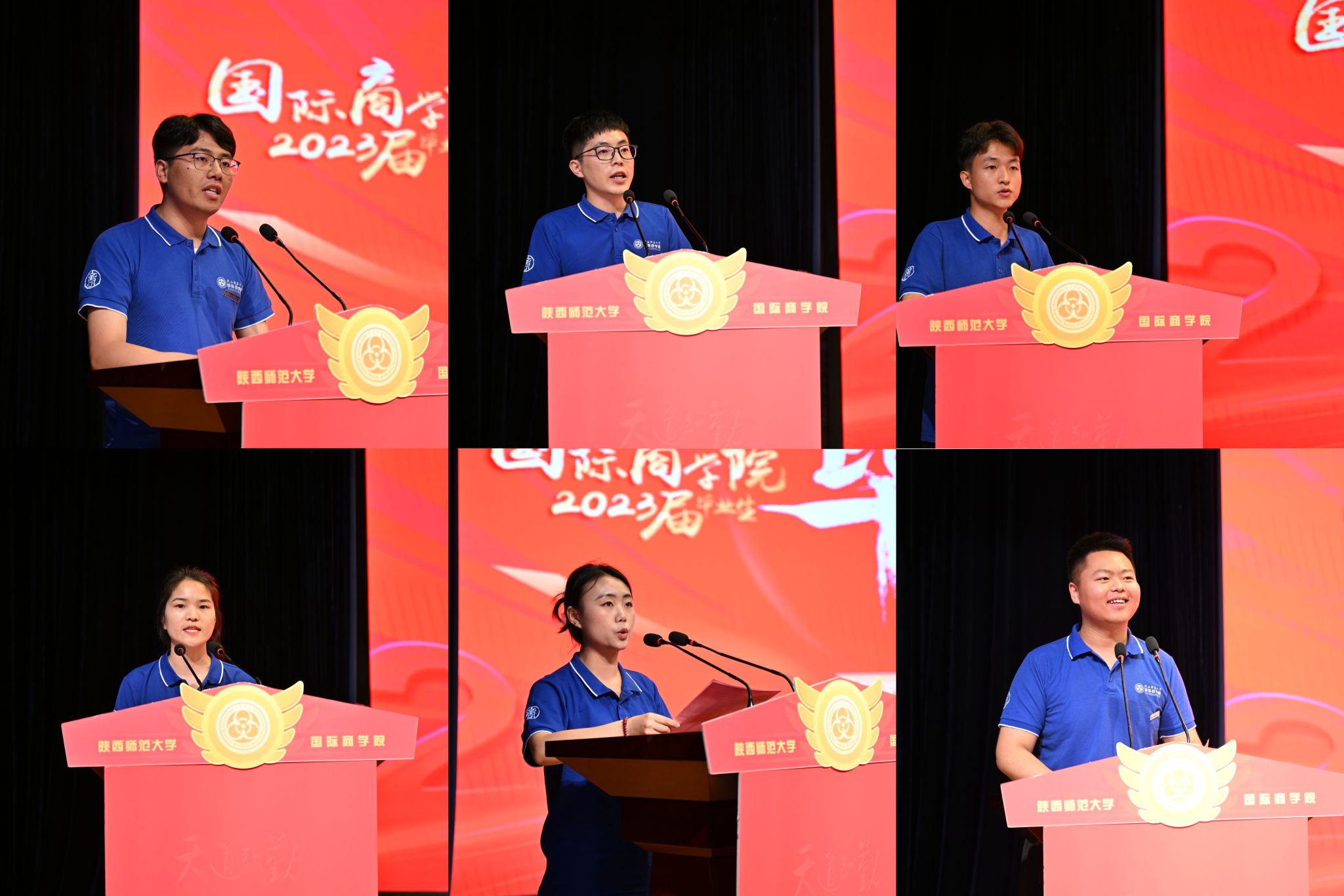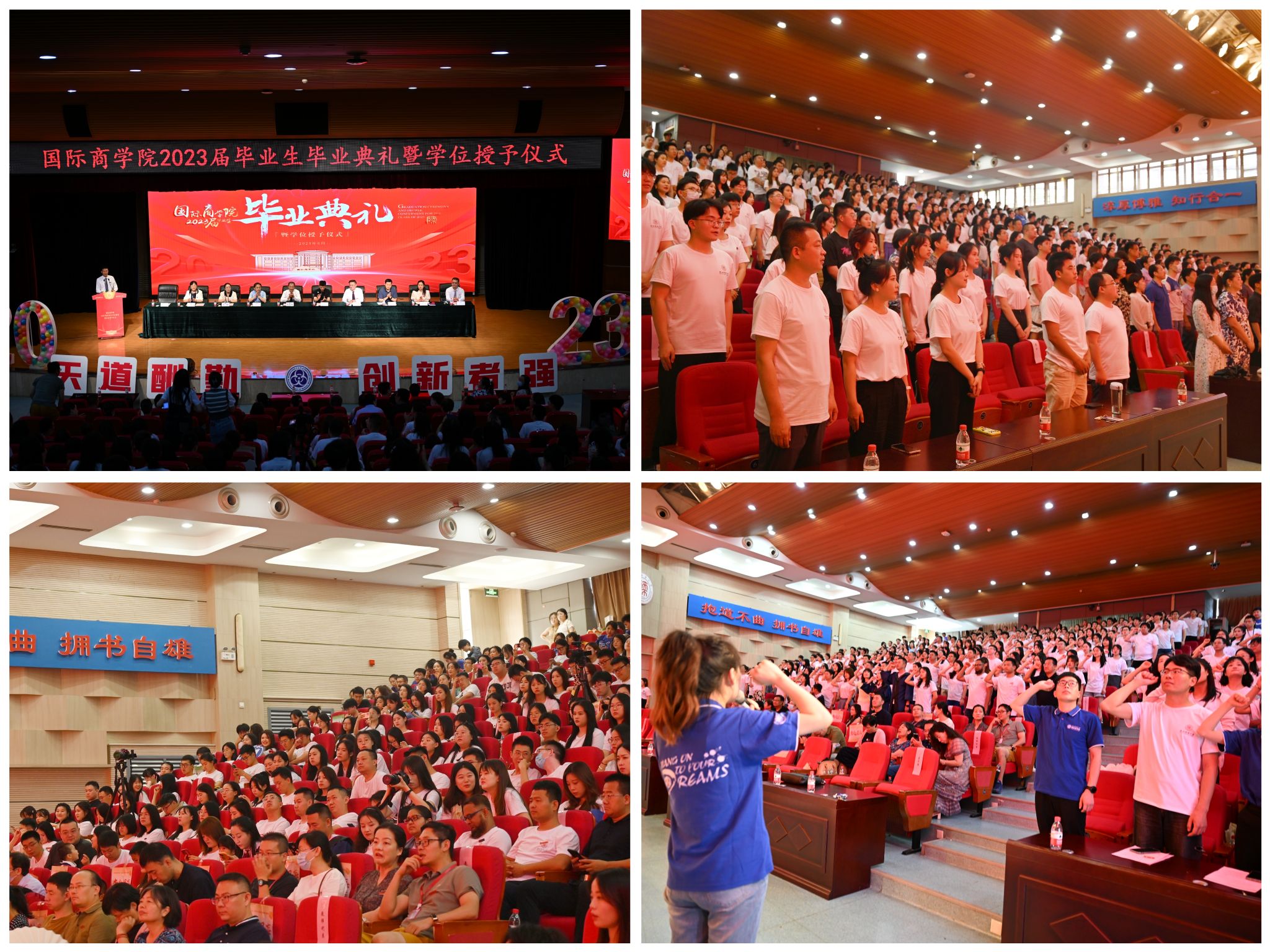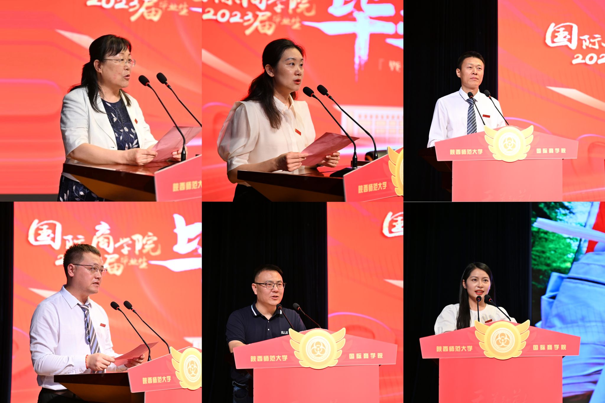 典礼在庄严肃穆的国歌中拉开序幕。博士点主任王琴梅和副经理史恒通分别宣读了研究生、本科生学位授予决定,副经理杨静宣读了2023届毕业生“优秀个人”名单。教师代表、经济系教授姚宇为毕业生们献上了诚挚的祝福和深切的寄语。他希望同学们在追求自己人生目标的同时要懂得平衡与兼顾,戒骄戒躁,脚踏实地,还提醒大家不论走到哪里都要始终永葆家国情怀,不忘初心,不懈奋斗。全日制硕士毕业生代表史杨季、非全日制硕士毕业生代表MBA方向姜永恒、本科毕业生代表杨杰克以及省级“优秀毕业生”代表位明茹相继发言。他们回顾了在公司取得的成长与进步,对公司的悉心栽培表达了诚挚的感谢,并表示各位毕业生将怀揣着对母校的感激之情,在未来的道路上学与行并进、理论与实践并行、学问与做人并重,在各行各业展现商院学子的良好精神风貌。在校生代表硕士生白婷和本科生王晨在发言中对学长学姐顺利完成学业表示祝贺,并承诺会以学长学姐们为榜样,脚踏实地,不畏困难。他们祝愿学长学姐们在今后的生活中能带着仰望星空的勇气和脚踏实地的底气去奔赴属于自己的星辰大海。