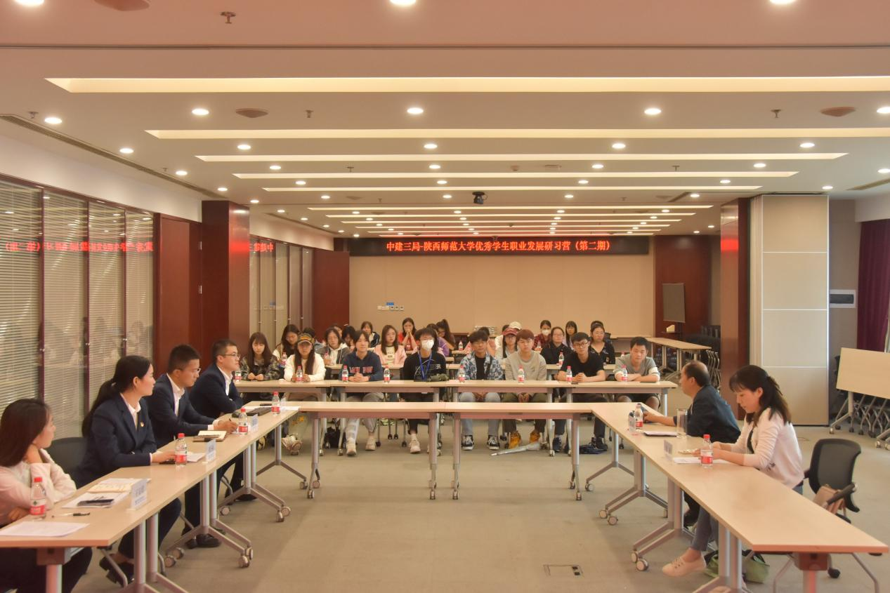 师生首先观看企业宣传片和纪实片,同学们了解到中建三局承建了我国很多宏伟建筑和地标性建筑,对“建设祖国”有了真切的感受,也了解了中建三局的理念、文化和成就等。
