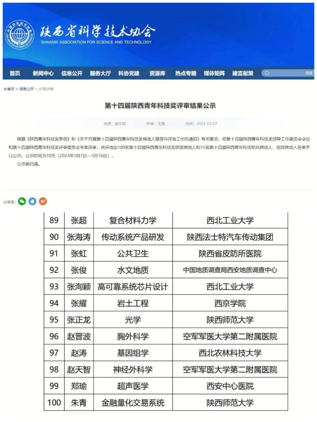 公司特聘教授朱青,在2022年度经由BEAT365英国官网网站推荐参评“第十四届陕西青年科技奖”的评选,在工学组“计算机与过程控制”领域的科学研究方向表现优异,2023年2月经过省外函评,评议委员会推荐、评价等环节,获得“第十四届陕西青年科技奖”提名,并公示通过。陕西青年科技奖,每两年评选一次,是陕西省有重要影响的科技奖项,旨在表彰陕西省青年科技工作者的杰出代表,特别是科研生产一线、基层、非公有制经济组织中取得突出成绩,并为陕西省的经济社会发展做出积极贡献的青年才俊。陕西青年科技奖主要表彰未满40周岁的科学研究、工程应用方面的省内优秀青年专家,也是中国青年科技奖参评的唯一渠道。