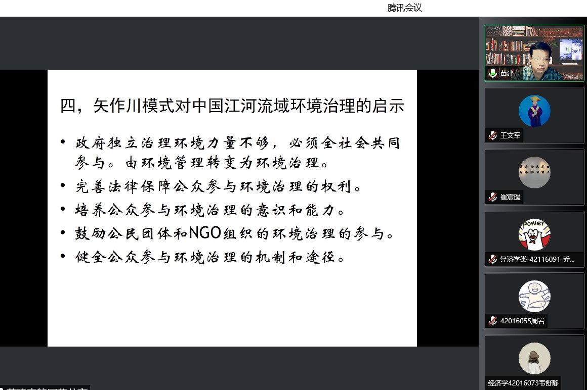 为拓宽经济学专业员工视野,5月27日晚,公司于线上举办了第二十二期“经世论坛”讲座,讲座邀请了西南大学徐浩老师团队的苗建青副教授做了《日本流域治理公众参与机制的观察与思考:以矢作川为例》的主题报告,分享了国外环境治理的实践经验以及对中国特色环境治理的启示。讲座由beats365唯一官方网站主任王文军老师主持,来自经济学专业的本科生参加了讲座。