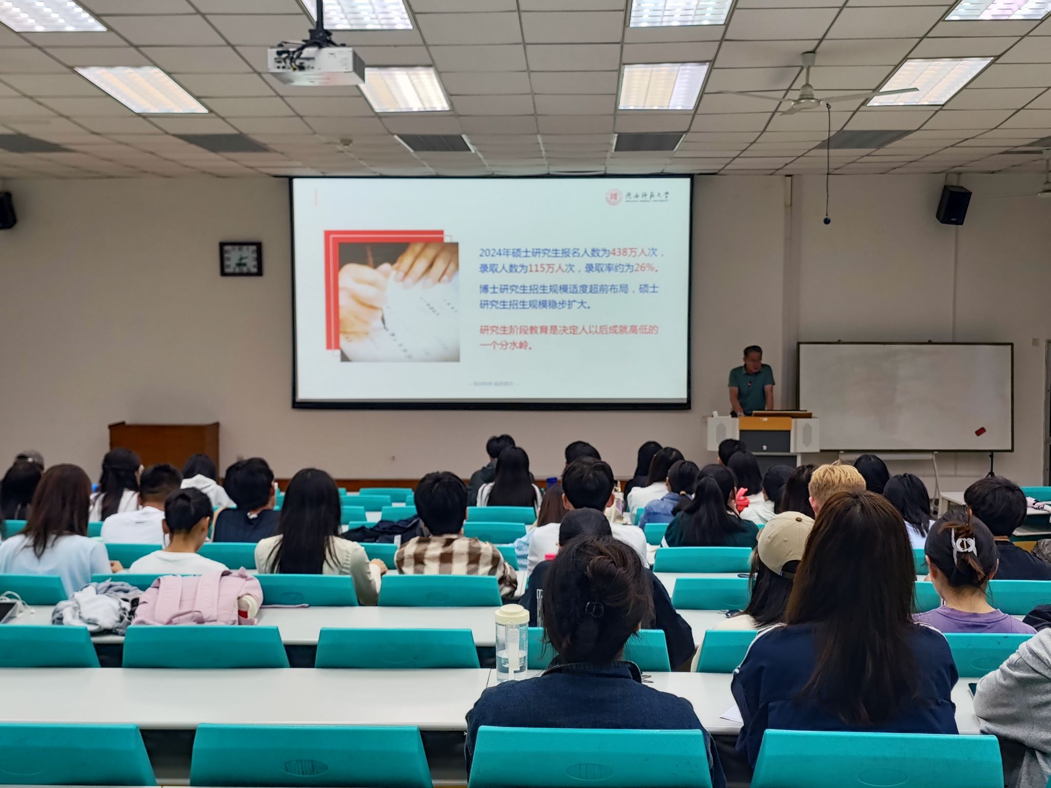 思培峰从研究生招生规模与录取数据入手,强调了研究生阶段教育在个人成就方面的重要性。接着,他展开分析了研究生思想成熟、认知能力强、科研任务重等特点和在课程学习、时间管理、思想政治素养、团队与社交等方面的生活模式,并提出了两点建议:一是要通过参加学术会议、学术交流活动等不断开拓学术视野;二是要做好时间管理,合理安排自己的课程、学术及生活。随后,思培峰就研究生“如何通过强化思想政治引领成为党和国家的高层次人才”提出几点要求:一是要用党的科学理论武装头脑,不断坚定政治立场;二是要充分利用科研实践平台,提升科研水平和创新能力;三是要自觉接受学术道德教育,强化自身道德修养。