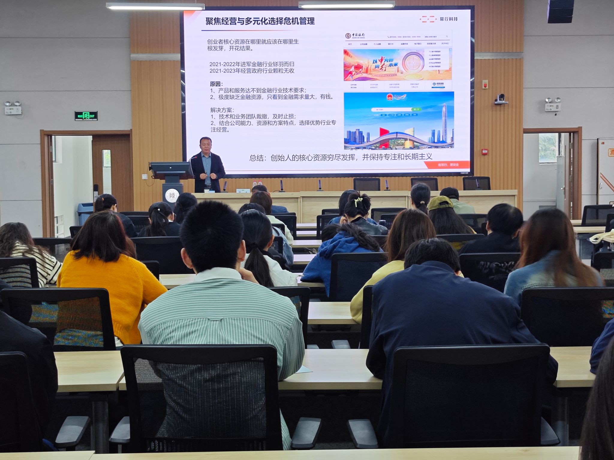 郭义以“创业十年危机管理”为主题展开分享。他简要介绍了常行科技有限公司的发展历史和运营情况,并从四个方面对企业在成长过程中遇到的危机以及化解方法进行了深入的剖析:一是合伙人机制危机与管理;二是“抱大腿”及资金链断裂危机与管理;三是疫情及关键技术负责人离职危机与管理;四是聚焦经营与多元化选择危机管理。郭义强调,创业者核心资源在哪里,就应该在哪里生根发芽,开花结果。