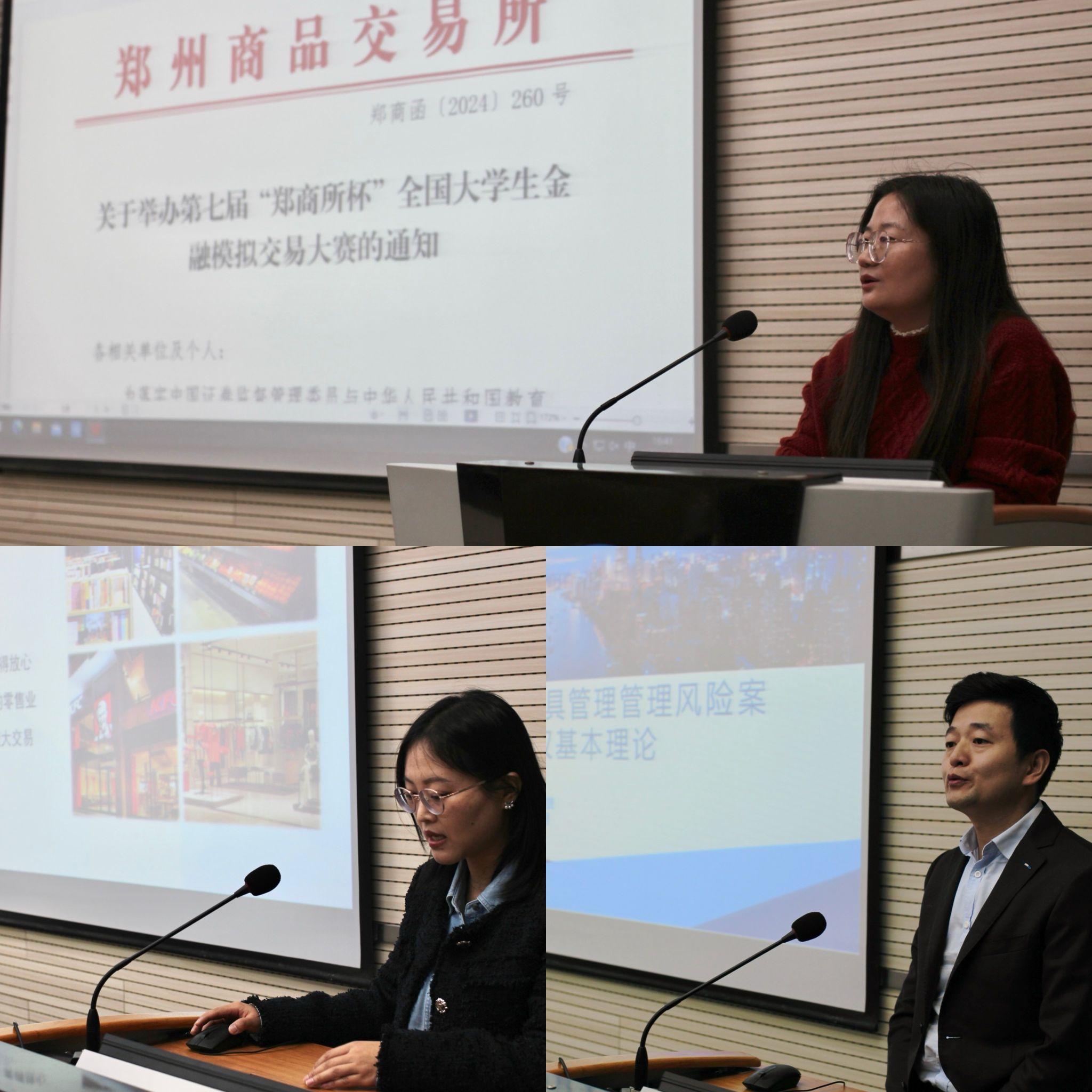 会议开始,周媛详细介绍了第七届“郑商所杯”全国老员工金融模拟交易大赛的报名方法、比赛规则及参赛平台等相关信息,并鼓励同学们积极参与,通过实践提升自己的金融知识和技能,为未来的就业实践打下坚实基础。接着由魏佩对期货相关知识进行详细介绍,魏老师深入浅出地讲解了我国期货市场的形成与发展、期货交易的特征和相关规则以及期货的功能与作用,并通过三个具体的企业案例帮助同学们更好地理解期货如何实现套期保值功能。会议最后由朱军龙进一步讲解期权期货的概念与功能、期权基本策略及各自实际运用案例,让同学们明晰了期权与期货的区别与联系,更透彻地理解了期货期权市场的运作原理。