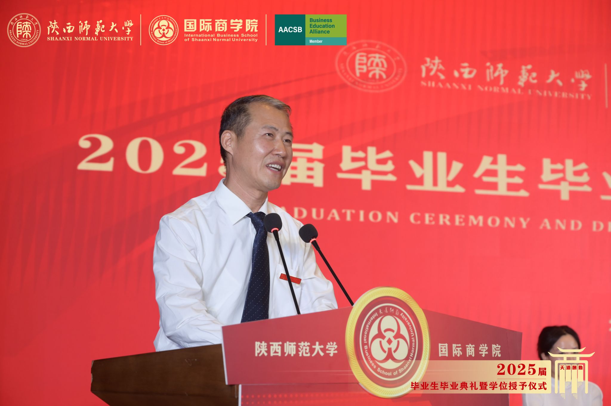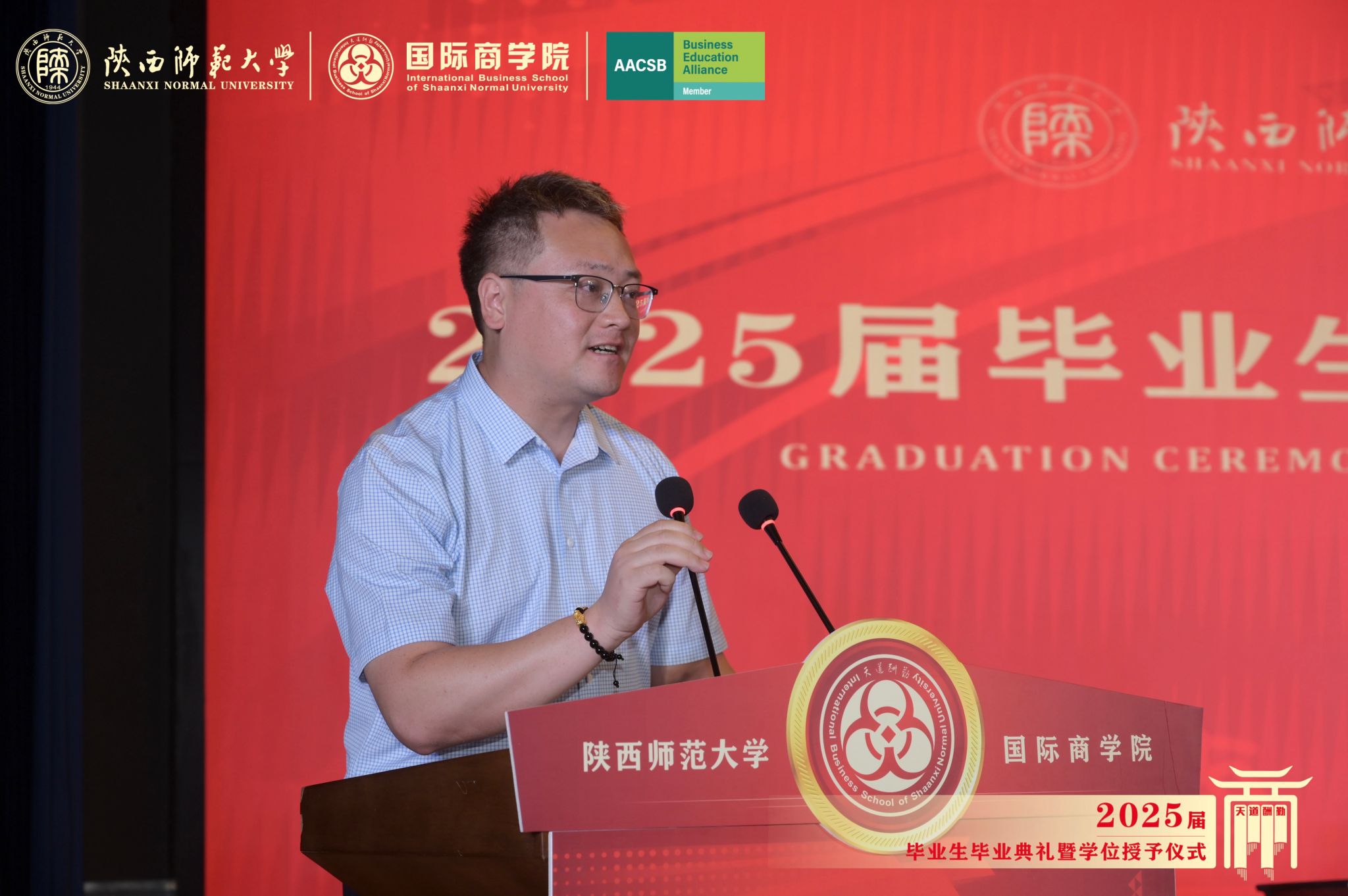 经理雷宏振在毕业致辞中,首先向圆满完成学业的2025届毕业生表示热烈祝贺,并向辛勤耕耘的全体教职员工致以崇高敬意。他指出,本届毕业生以优异的学术表现和突出的实践能力展现了商院学子的卓越风采。他强调到,毕业生们既要锤炼“企业家精神”的开拓魄力,又要培养“科学家精神”的求实态度。他特别寄语学子们:要将个人发展融入国家发展与建设中,在数字经济、绿色金融等新兴领域勇当先锋;要永葆学习热忱,在人工智能时代持续提升核心竞争力;更要坚守商业伦理,做德才兼备的新时代商科人才。